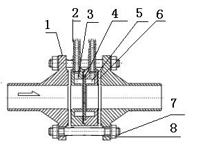 1、法蘭  2、導(dǎo)壓管  3、前環(huán)室  4、節(jié)流件  5、后環(huán)室  6、密封墊片 7、螺栓  8、螺母